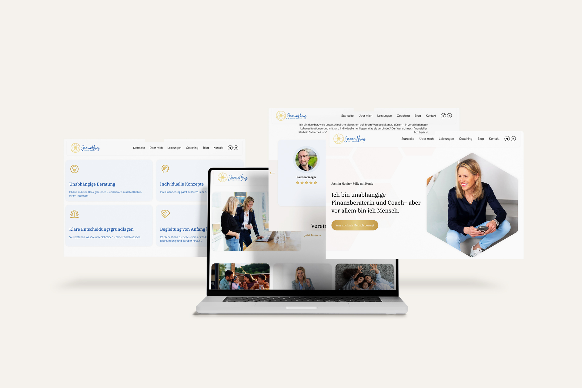 Jasmin Honig begleitet Menschen bei finanziellen Entscheidungen und wir durften dafür den passenden Auftritt entwickeln. Vom neuen Logo über den Webauftritt bis zur Businessfotografie haben wir ihre Marke neu gestaltet und klar positioniert. Ziel war ein Auftritt, der professionell wirkt und gleichzeitig persönlich bleibt.
